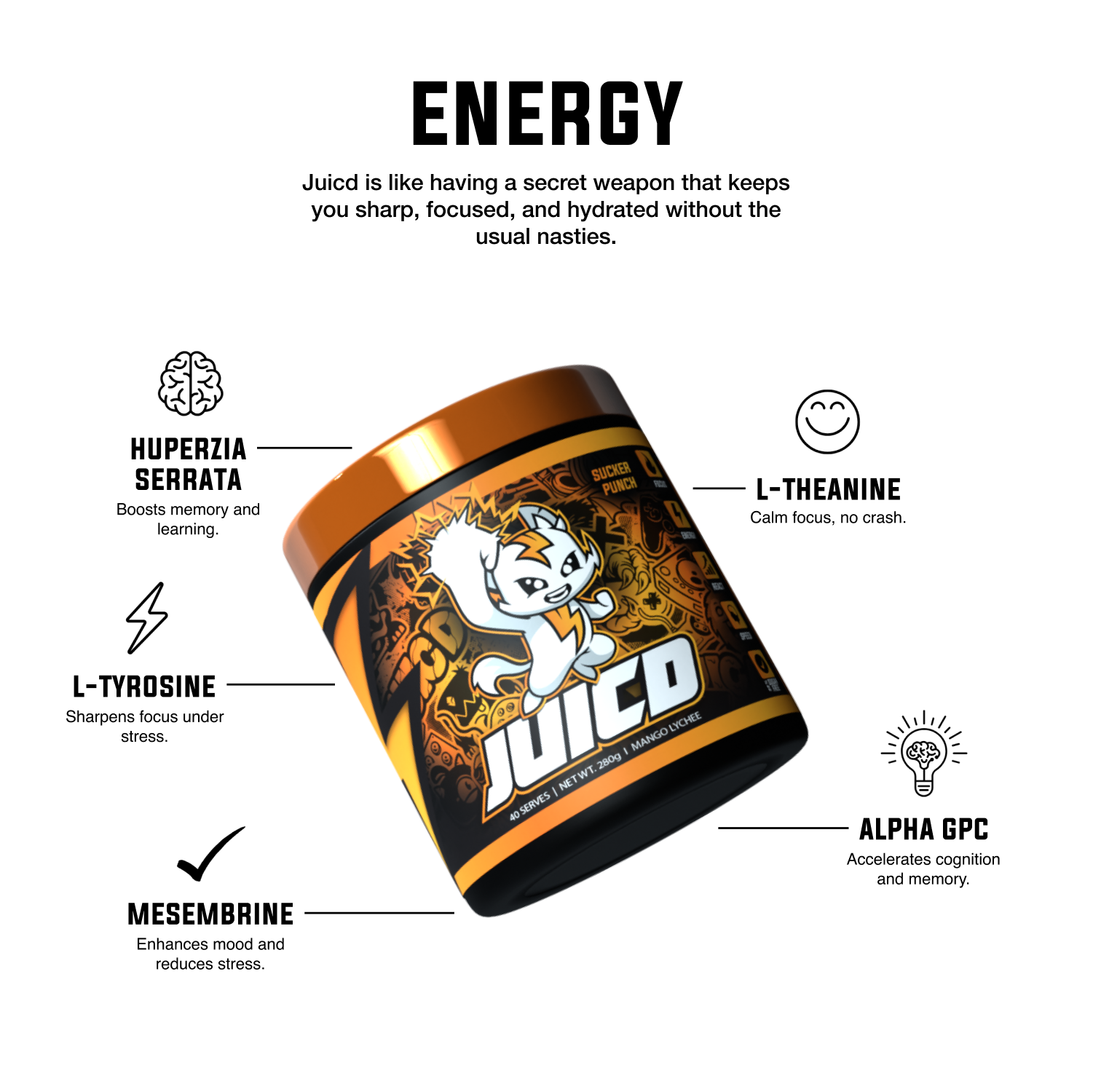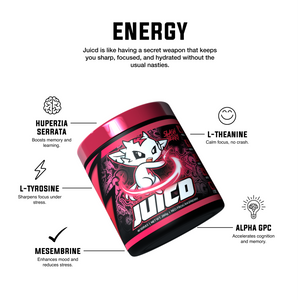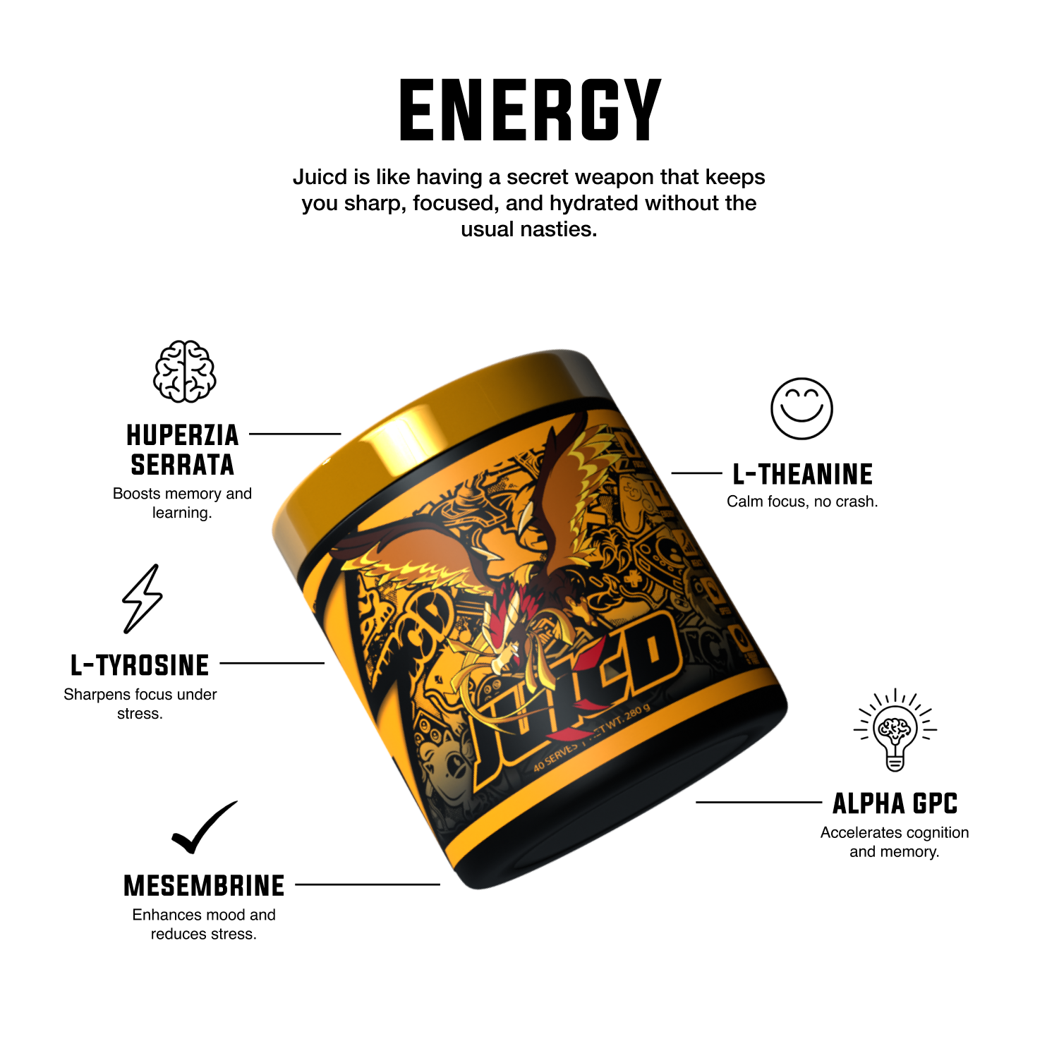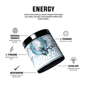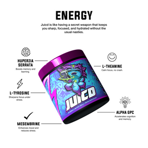 Why not? Imagine a world where your energy drink is low-calorie, 99% sugar-free, and packed with caffeine, Alpha GPC, plus a bunch of brain-boosting nootropics and minerals. That's Juicd. It's like having a secret weapon that keeps you sharp, focused, and hydrated without the usual nasties.